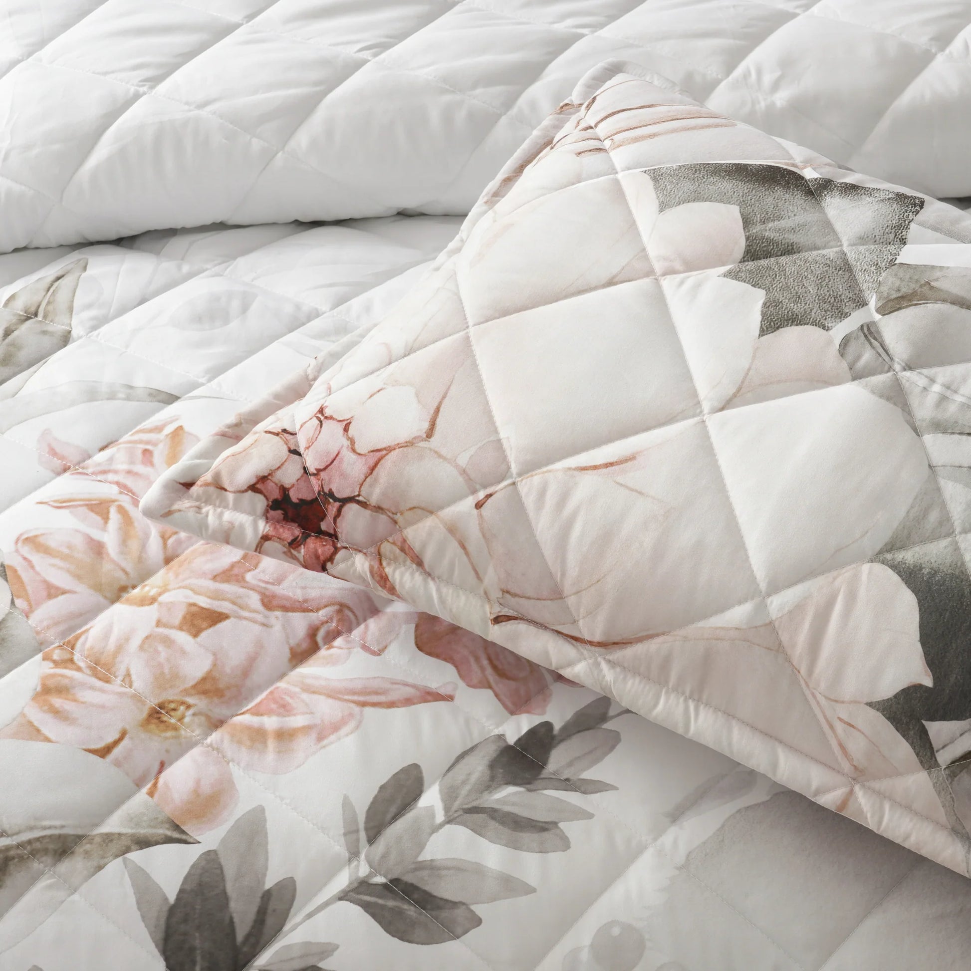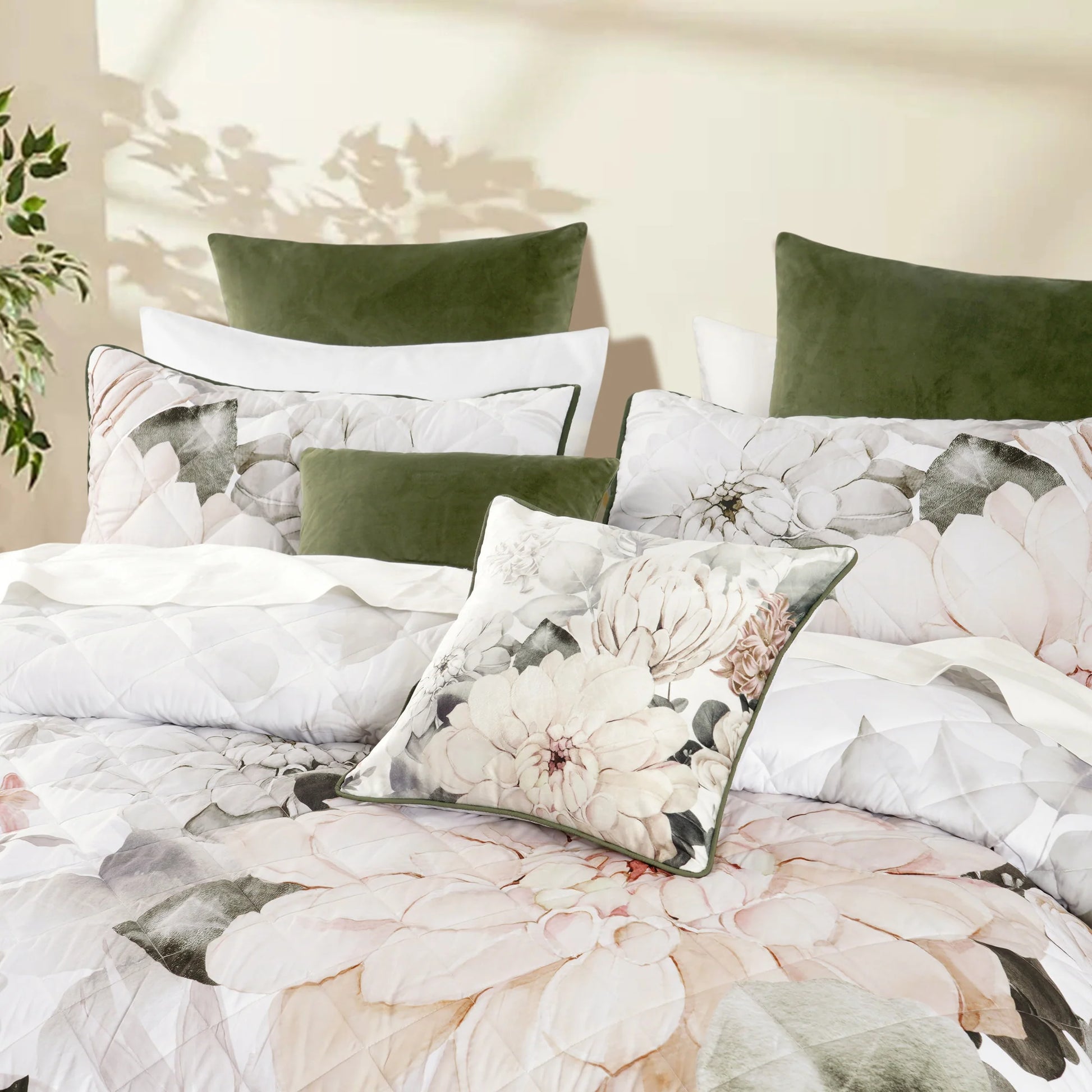 Stunning large florals and foliage sweep over the bed in gorgeous neutral tones and features a variety of exquisite green hues. Elegantly cuffed edging in green and quilted in a timeless diamond quilting pattern complements the coverlet beautifully. The addition of the forest green velvet european pillowcases and velvet coordinate cushion completes the story.