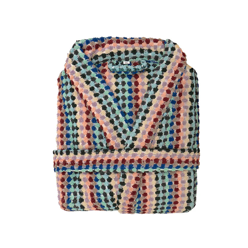 Our gorgeous Miami robe and towel range is a luxurious and more sustainable choice for your bathroom. Made from upcycled cotton and upcycled polyester, these towels give new life to quality fibres that would otherwise go to waste. Featuring a stunning mix of coloured yarns in rows of small circles or 'pom poms', and a subtle stripe detail along the edge, they will look beautiful in any bathroom. The robe, which includes two pockets and a belt, is not only stylish, but also soft and cosy to wear. Coordinating bath sheets, hand towels and face washers also available.